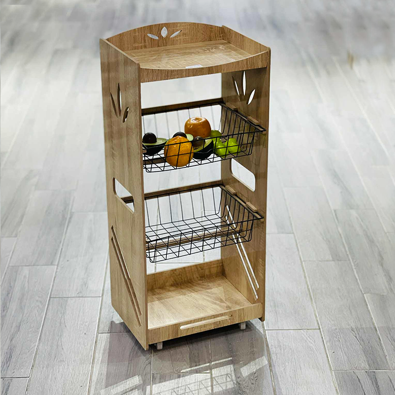 Porte légumes en bois avec 3 paniers tiroirs en métal grillagé et un tiroir en bois. Ce petit meuble d'appoint pour cuisine est sur roulettes permettant un déplacement facile. Pratique, vous pouvez ranger dans cette desserte de cuisine à roulettes toutes vos courses et notamment vos fruits et légumes dans les tiroirs grillagés.
