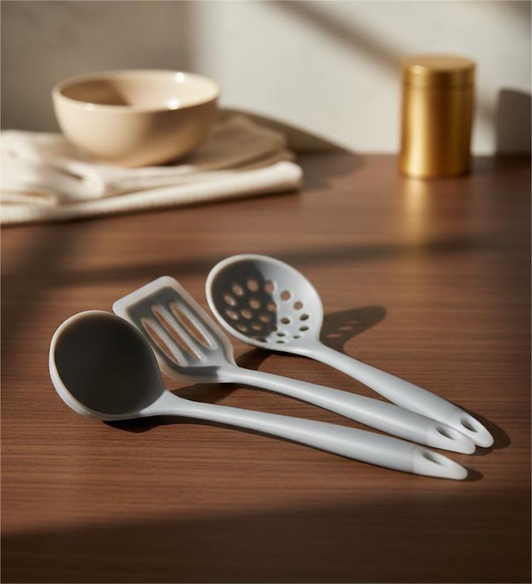 ensemble d'ustensiles de cuisine en silicone gris comprenant une louche, une spatule ajourée et une cuillère .