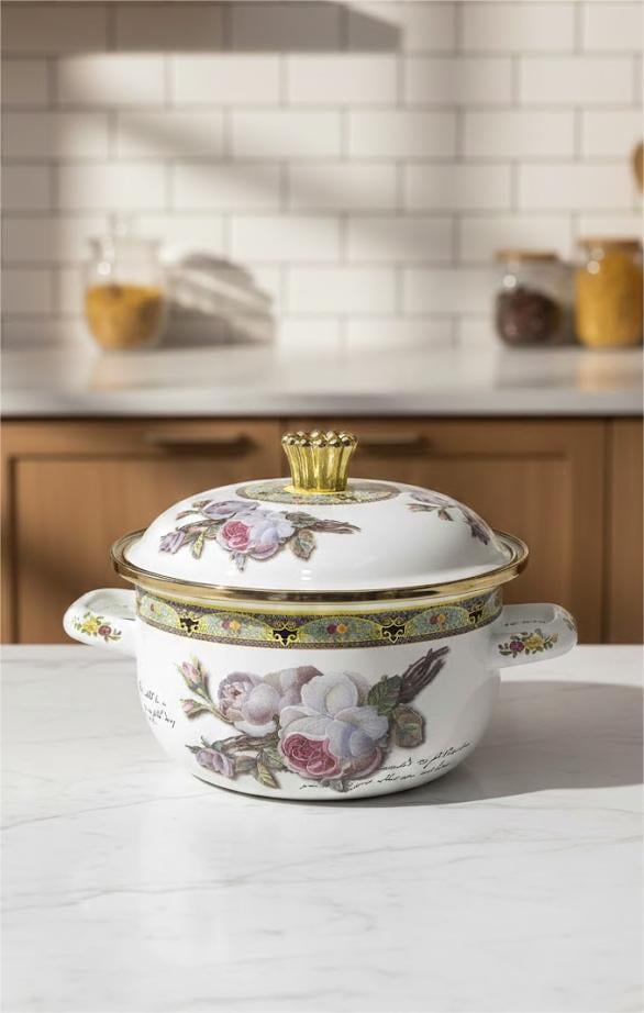 C'est une marmite à soupe en émail imprimé de style vintage