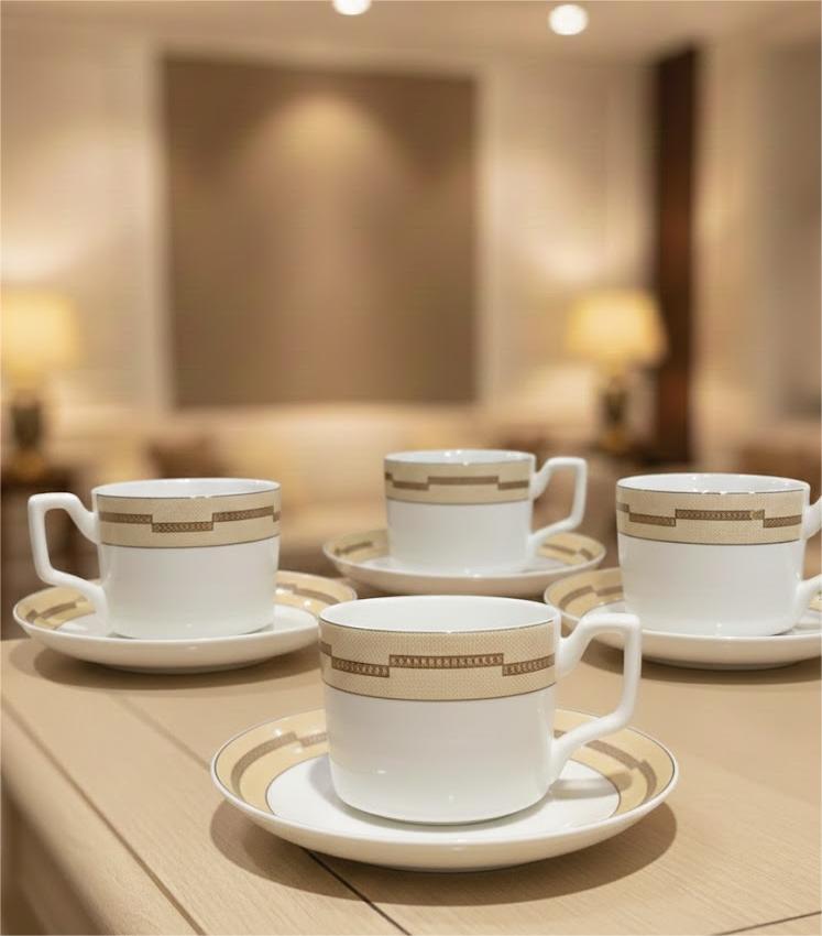 ce service à café en porcelaine fine. Chaque tasse et soucoupe est ornée d'un motif géométrique raffiné dans des tons beige et or, alliant un style classique à une esthétique moderne et chic