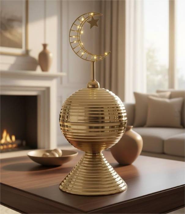 c'est une bonbonnière dorée ou un plat à dessert décoratif, souvent utilisé dans le cadre des décorations islamiques pour le Ramadan et l'Aïd