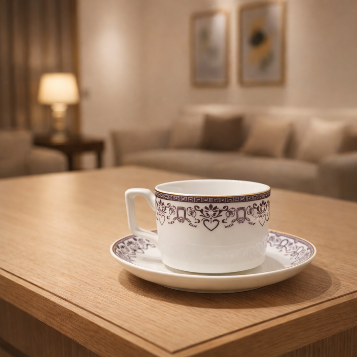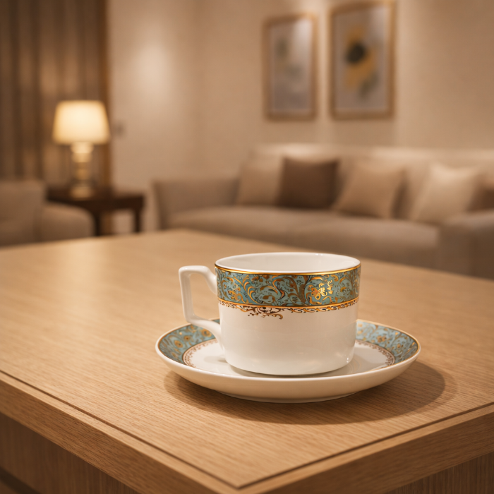 ce service à café en porcelaine fine. Chaque tasse et soucoupe est ornée d'un motif géométrique raffiné dans des tons beige et or, alliant un style classique à une esthétique moderne et chic